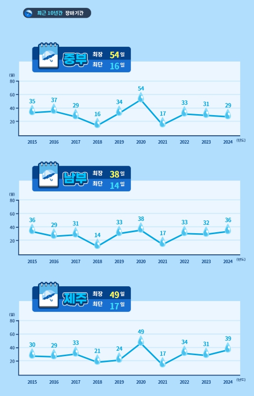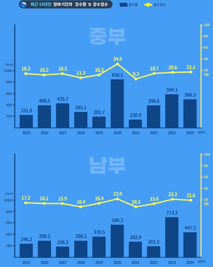 - 2024년: 장마일수는 가장 길었으나, 강수량은 2023년에 비해 약 1/3 수준