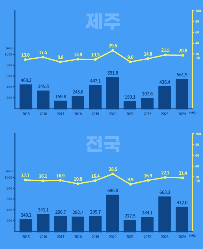 - 특히 2024년에는 장마기간 39일 중 23일 비, 총 741.5mm로 최근 4년 중 최다