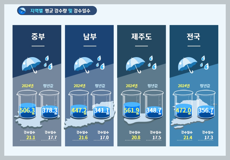 2024년 장마는 전국적으로 평년보다 길고 강한 비가 특징이었습니다. 특히 제주와 중부, 남부 모든 지역에서 강수량과 강수일수가 모두 상승했는데요, 아래 표를 통해 한눈에 정리해볼 수 있습니다.